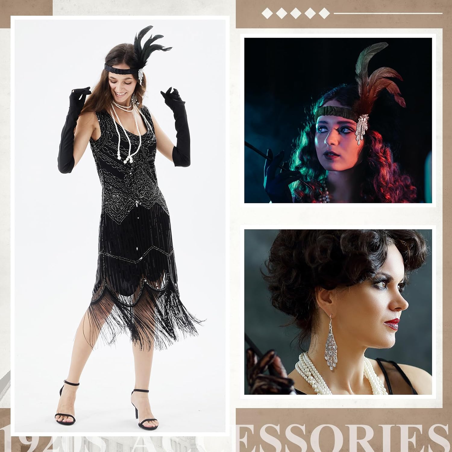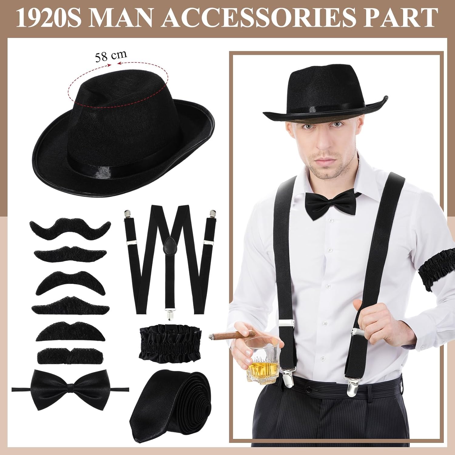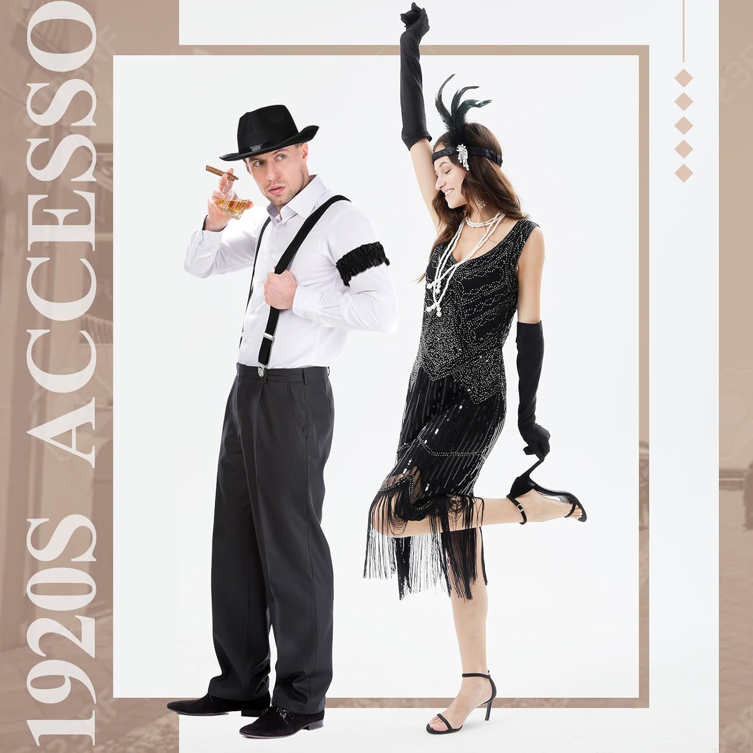 Feature: 1920S memory and Halloween cosplay costume: These pieces will take you back to the 1920s and give you a stylish 1920s look, different times have different popular styles, you can wear the set and go back to the roaring 1920s party, you can wear the set for other Halloween themed parties, which will bring you much fun Novel gifts: The men and women costume accessories come with rich styles and are convenient to make different combinations, easy to wear, and add lots of fun to your parties, they are also nice gifts for your companion, son, father, and other people Specifications Material: satin, polyester, faux leather, alloy, felt Main color: black Size: as the picture shows Package include: 1 x Retro sequins fringed flapper dress 1 x Feather flapper headband 1 x Vintage dangle earrings 1 x Long black gloves 2 x Pearl necklace 1 x Black vest strap 1 x Gentleman hat with ribbon 1 x Bow tie 1 x Necktie 2 x Wristbands 2 x Tie clips 1 x Imitation cigar 6 x Fake mustaches Notes: Manual measurement, please allow slight errors on size. The color may exist a slight difference due to different screen displays. If you use our products with your own necklace or pendant, please check whether the product is in good condition before use to avoid unnecessary loss of personal property. Our product is not suitable for sensitive skin. Test whether there is any allergy on a small part of your skin before use. Please stop applying if there is any discomfort, and please be careful to gently remove the product to avoid skin injury. Please do not wash our products with other clothes, and bleaching is not allowed. Winding risk may exist, please keep our product away from children.