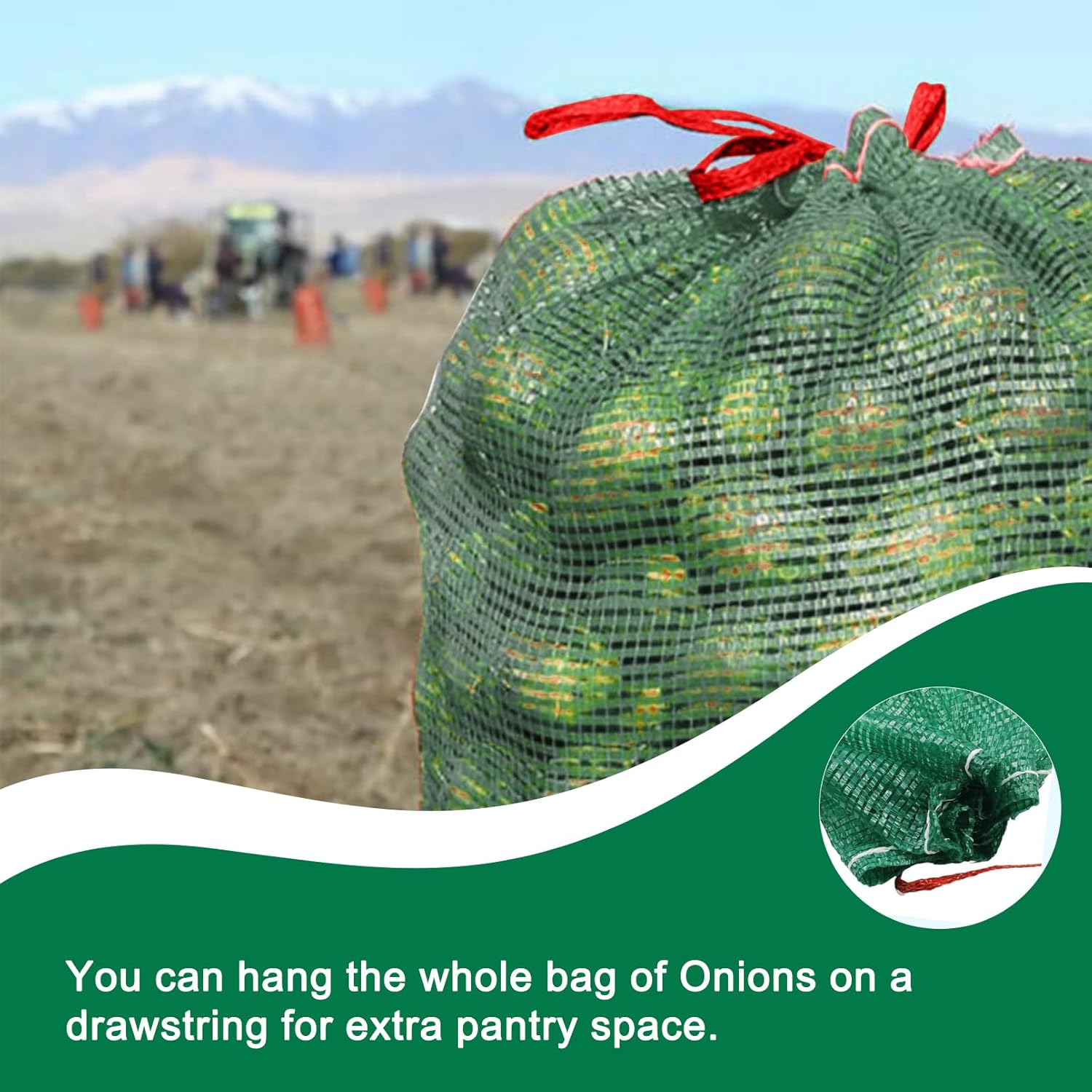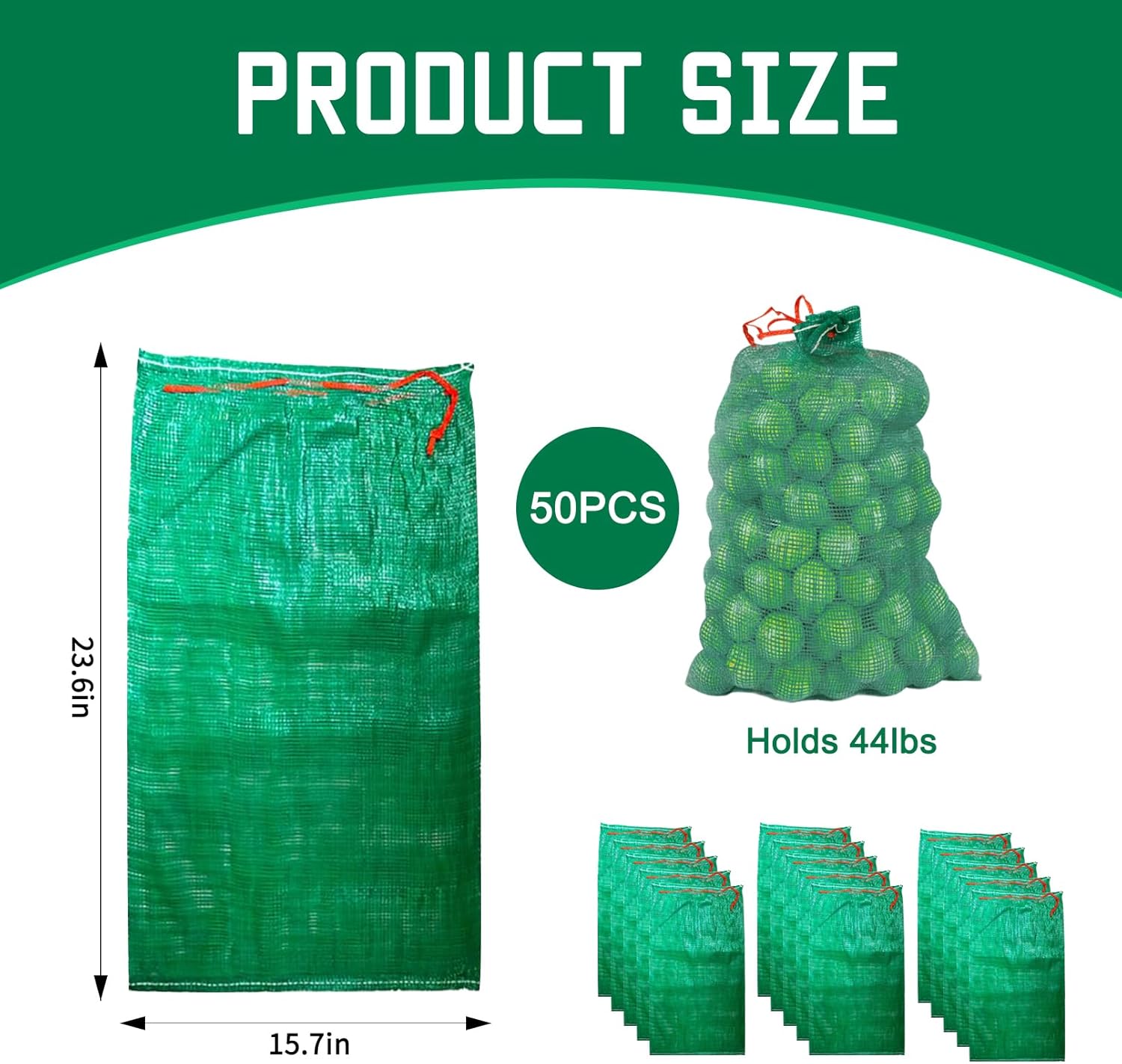 Features: 1. The breathable mesh bag can let the crops that need to be stored release excess water, maintain air circulation, make agricultural products not perishable, more conducive to long-term storage; 2. weaving mesh bags can ensure that produce don't leak out 3. The drawstring is firm and strong, which can be easily sealed and suspended, the onions bag is strong, also will not scratch the skin. Details: Size: RED:13.8 x 19.7 inches(35*50CM )/ Green 15.7 x 23.6 inches(40*60CM)/Yellow 19.7 x 31.5 inches (50*80CM) Material: High quality polypropylene Color: Red/Green/Yellow Capacity: Red- 33 pounds,Green-44 pounds,Yellow-77 pounds It can be used to store corn, potatoes, Onions, pumpkins and other products The package includes: 50 pcs mesh produce bag