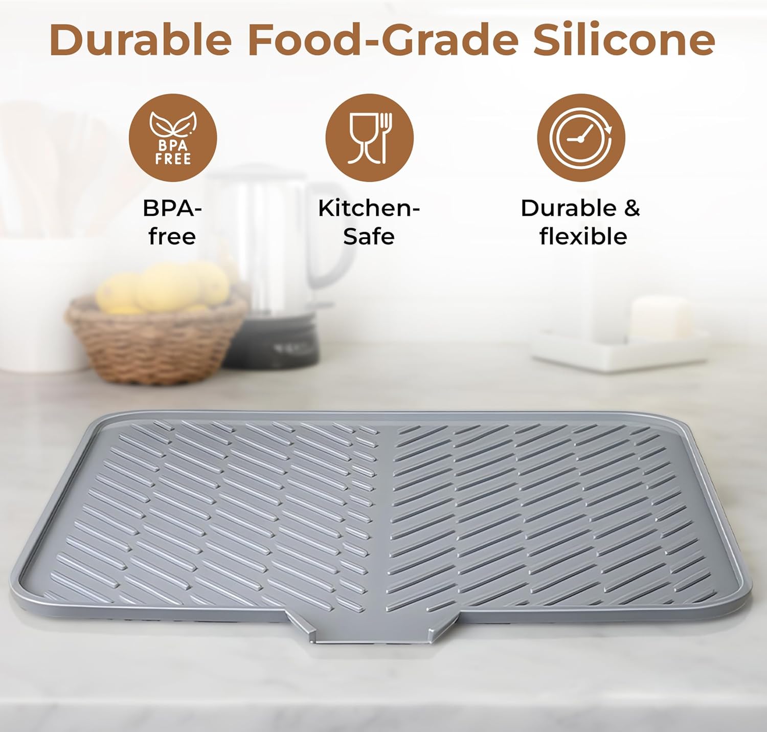Achieve organization and elegance in your kitchen effortlessly. With Luxet’s Silicone Dish Drying Mat, you can maintain a pristine countertop while efficiently drying your kitchenware. Measuring 23.6" x 17.7", this mat offers a stylish and space-saving solution for drying dishes, glasses, pots, and utensils. Its flexible silicone construction ensures durability and resistance to heat and water, making it perfect for daily use. Featuring a Ridge design with diagonal ridges and a built-in drain lip, it facilitates easy water removal and prevents moisture buildup and odors. Keep your kitchen clean and hygienic with Luxet’s versatile mat, which also doubles as a protective surface for hot styling tools or as a trivet.
