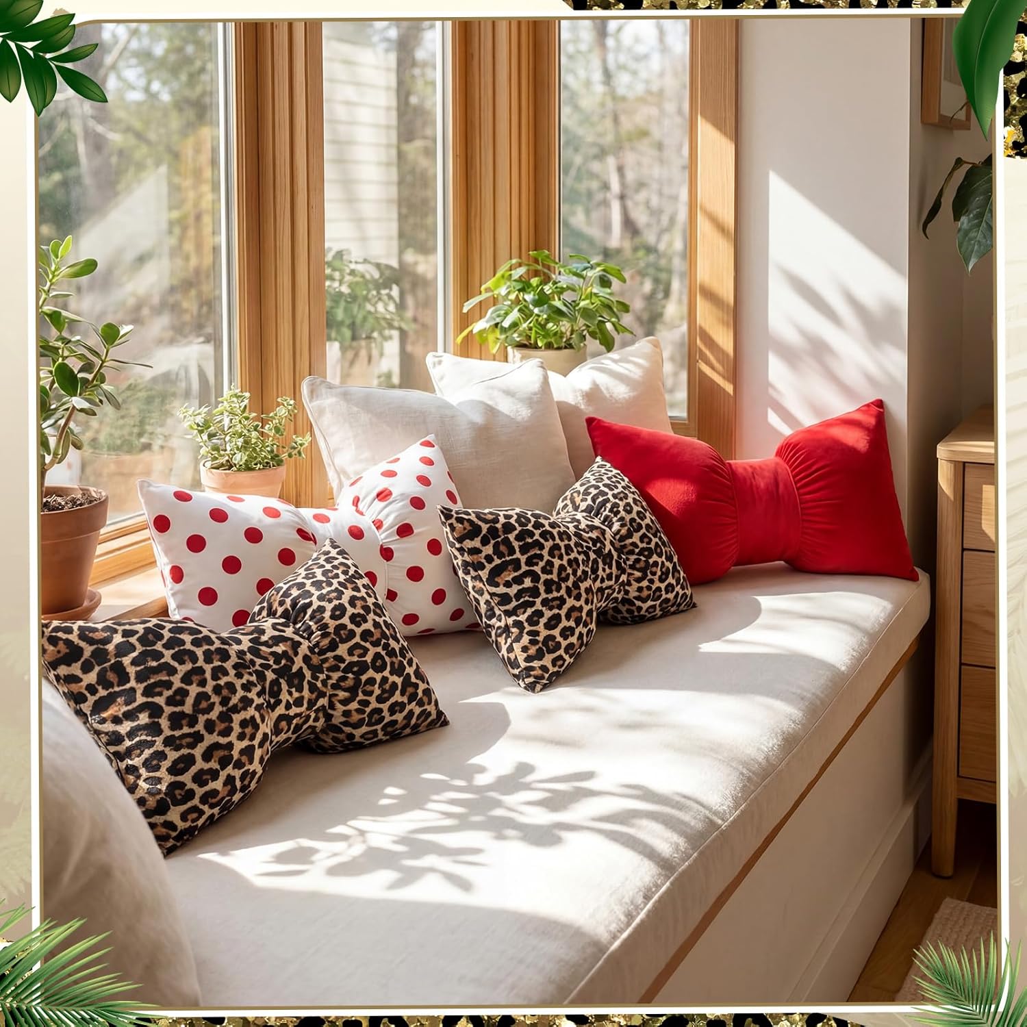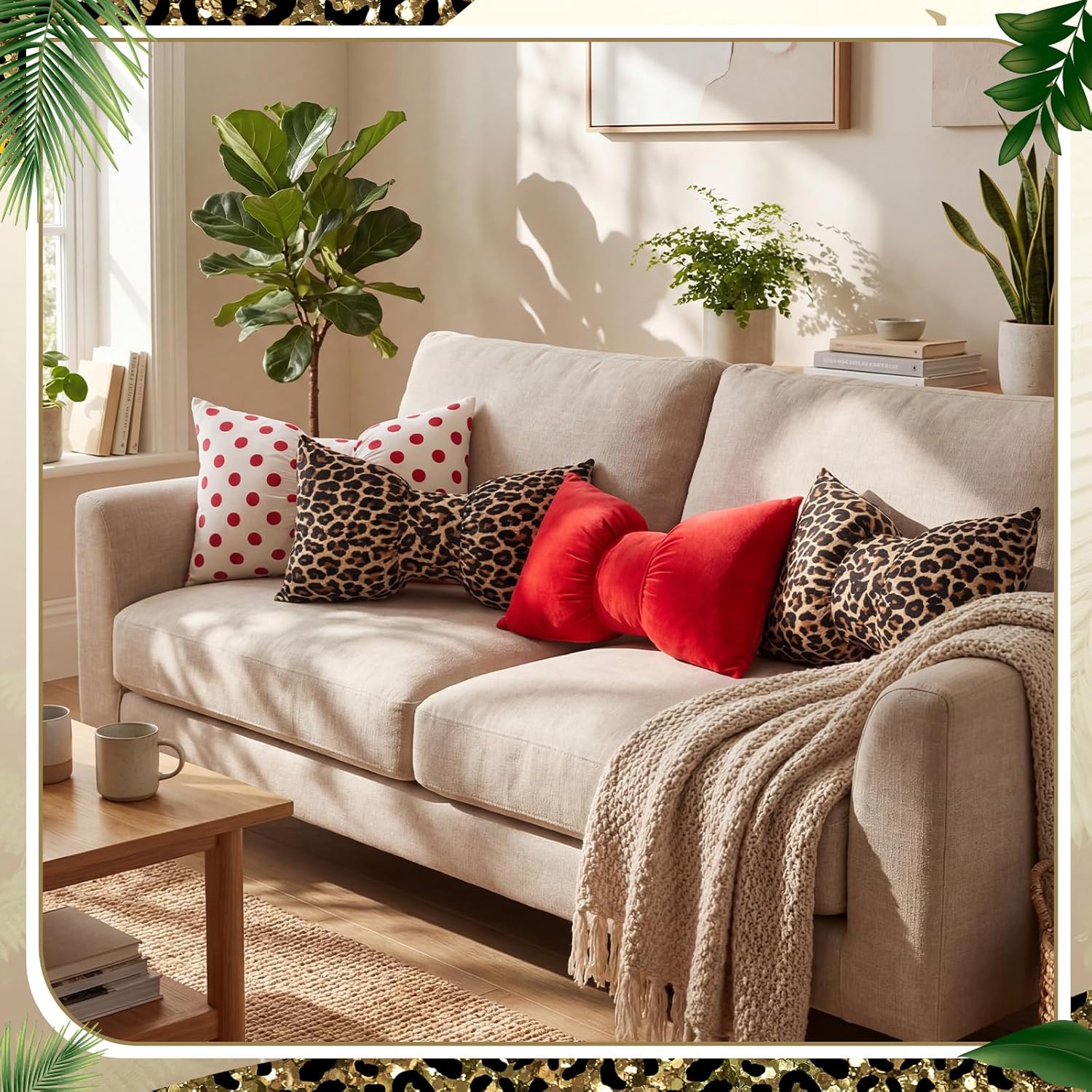 Features: Quality Product: This bow pillow is made of comfortable velvet, which is soft and warm, elastic, not easy to deform, breathable and fluffy. Every time you hold this plush bow pillow in your arms, it will bring a comfortable feeling to you and your family. Charming Variety Embrace the variety with this pillow package that includes a delightful mix: 2 leopard print bow throw pillows, 1 polka dot, and 1 red. Each pillow offers its charm, harmoniously combining to create a unified yet diverse look that enriches any interior space. Specifications: Material: velvet Color: red, white, leopard print Size: 20 x 12 inches/ 50 x 30 cm Package includes: 2 x Leopard print pillow 1 x Red pillow 1 x Polka dot pillow Notes: Manual measurement, please allow slight errors on size. The color may exist a slight difference due to different screen displays