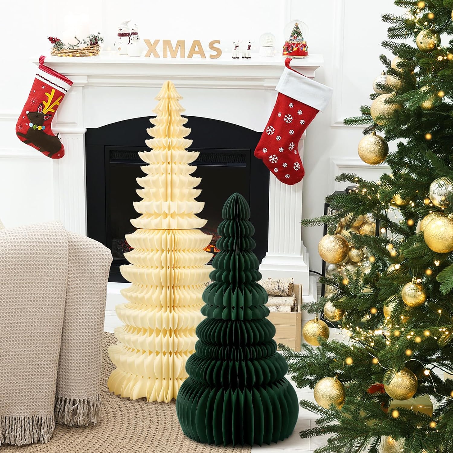 Features: Colorful Christmas Charm: Enhance your holiday decor with these vibrant honeycomb paper Christmas trees. In classic green and white, they effortlessly complement any vintage rustic theme. Ideal as a centerpiece for your Christmas party or family gathering, these cut paper Christmas trees infuse joy and elegance into your celebrations. Reusable Festivities: Embrace the practicality of our foldable paper Christmas tree design. Built for repeated use, these three-dimensional paper creations maintain their beauty without permanent space occupation. Simply pack them away ready for next year's festivities, combining convenience with charming holiday cheer. Specifications: Material: paper Color: green, white Size: 47 inches/ 119.38 cm(H) and 35 inches/ 88.9 cm(H) Package includes: 2 x Honeycomb Christmas tree Notes: Manual measurement, please allow slight errors on size. The color may exist a slight difference due to different screen displays