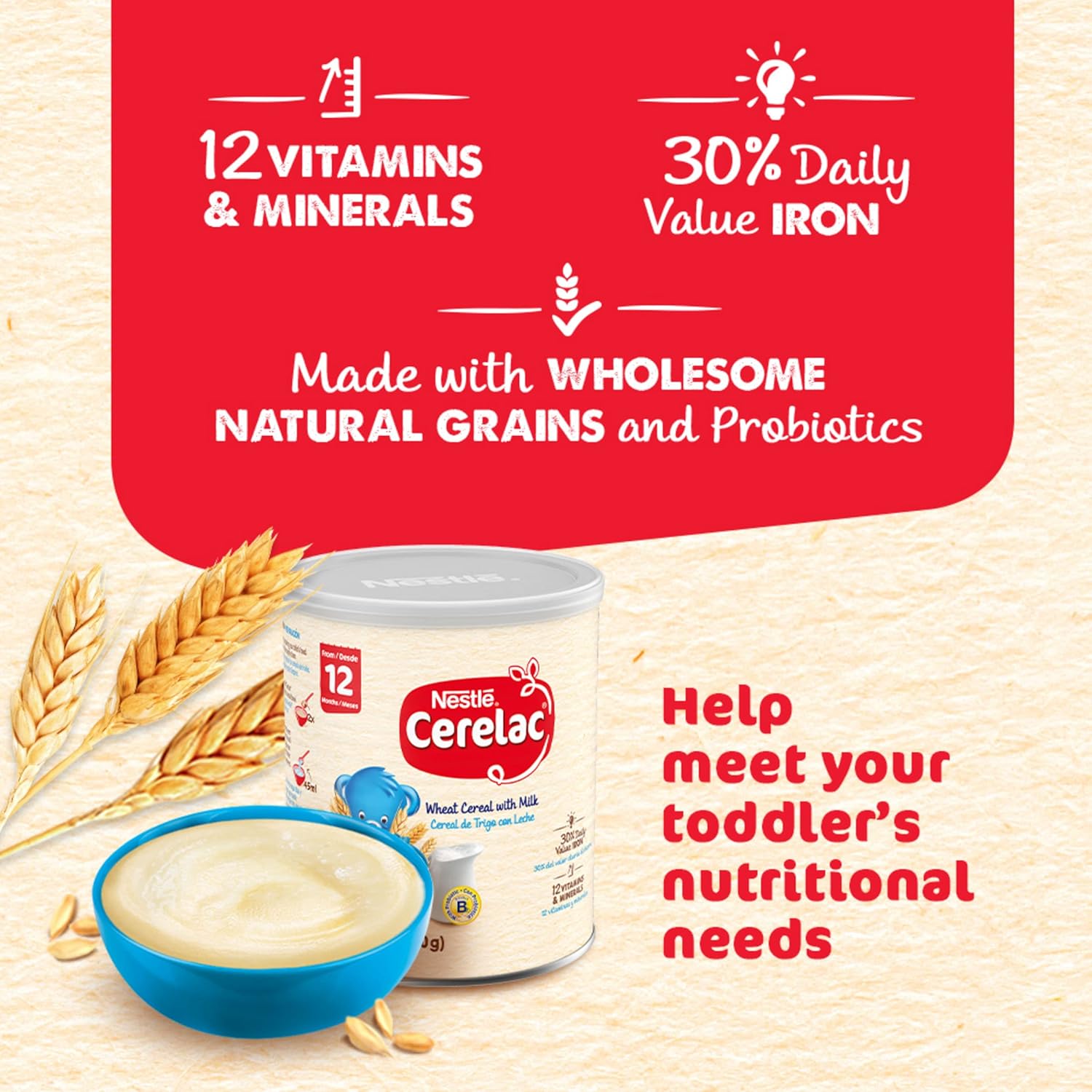Nestle Cerelac Cereal, Wheat Cereal with Milk, 14.1 Ounce Canister: Made for Toddlers 12 months. Made with wholesome grains and vitamins and minerals, including iron to help support brain development and learning ability. Two servings of Cerelac Wheat Cereal with Milk provides 60% daily value of iron. Cerelac is crafted from wholesome natural grains to help nourish little tummies. Simply add warm water and stir until creamy for a satisfying cereal for your little one. Our Wheat Cereal with Milk contains B. Lactis cultures, a probiotic that helps support digestive health when eaten regularly.