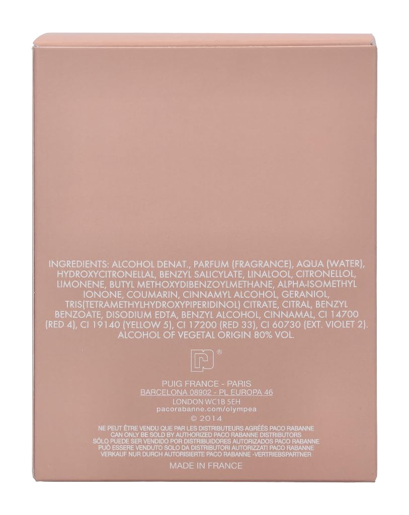 Olympéa by Paco Rabanne is a Amber Floral fragrance for women. Olympéa was launched in 2015. Olympéa was created by Loc Dong, Anne Flipo and Dominique Ropion. Top notes are Water Jasmine, Ginger flower and Green Mandarin; middle notes are Salt and Vanilla; base notes are Ambergris, Cashmere Wood and Sandalwood.