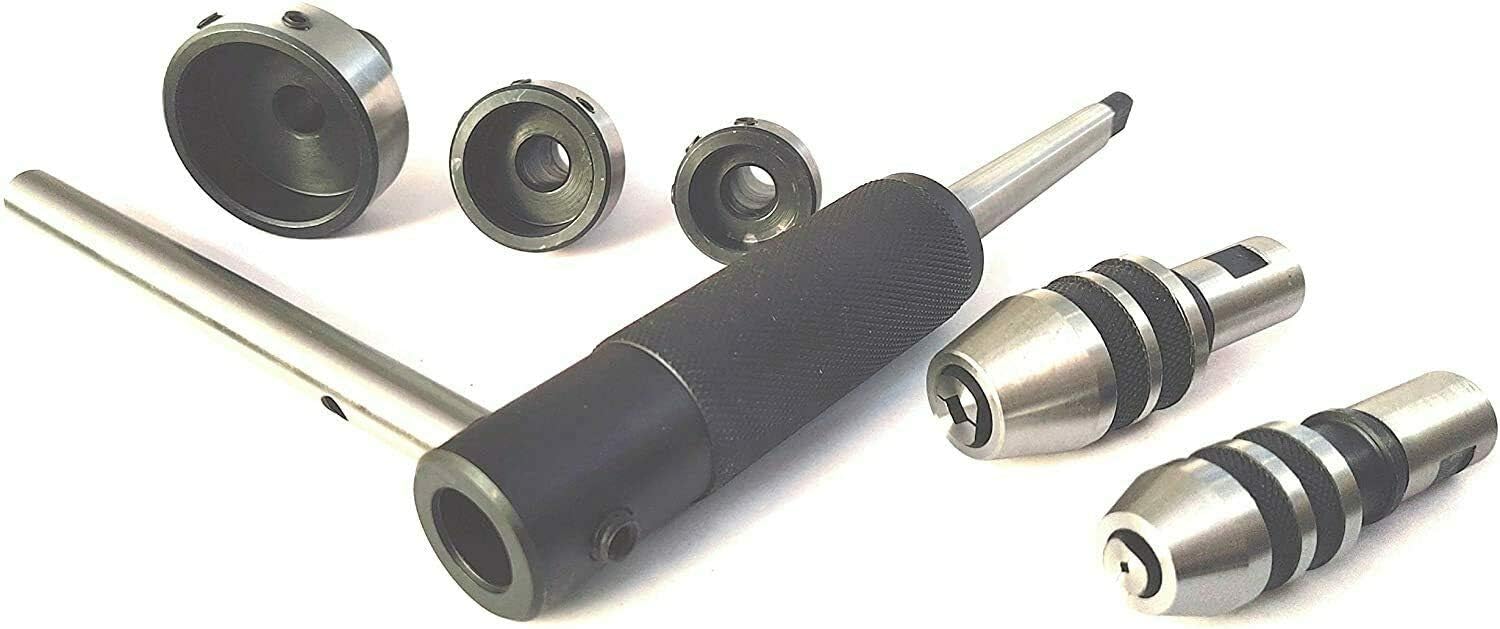LATHE TAILSTOCK TAP & DIE HOLDER SLIDING TYPE SET IN MT2 SHANK Made of High Quality Tool Steel , this is a high quality product for your lathe machine * Used for threading and tapping purpose on the lathe machine * Die Holder Sizes 13/16", 1" & 1-1/2" . * Tapping Capacity of the Tap Wrench : 1/16" to 1/4" & 1/4" to 1/2" * Comes in precisely ground MT2 Shank, that goes inside your lathe tailstock & intended job for threading / tapping is hold in rotating chuck. * The Die for threading purpose is hold in the various Die holder sizes. The internal bore threading/ tapping is done by mounting the tap wrench head as per tap size between the above advised range is moved toward the rotating job in the lathe's chuck.