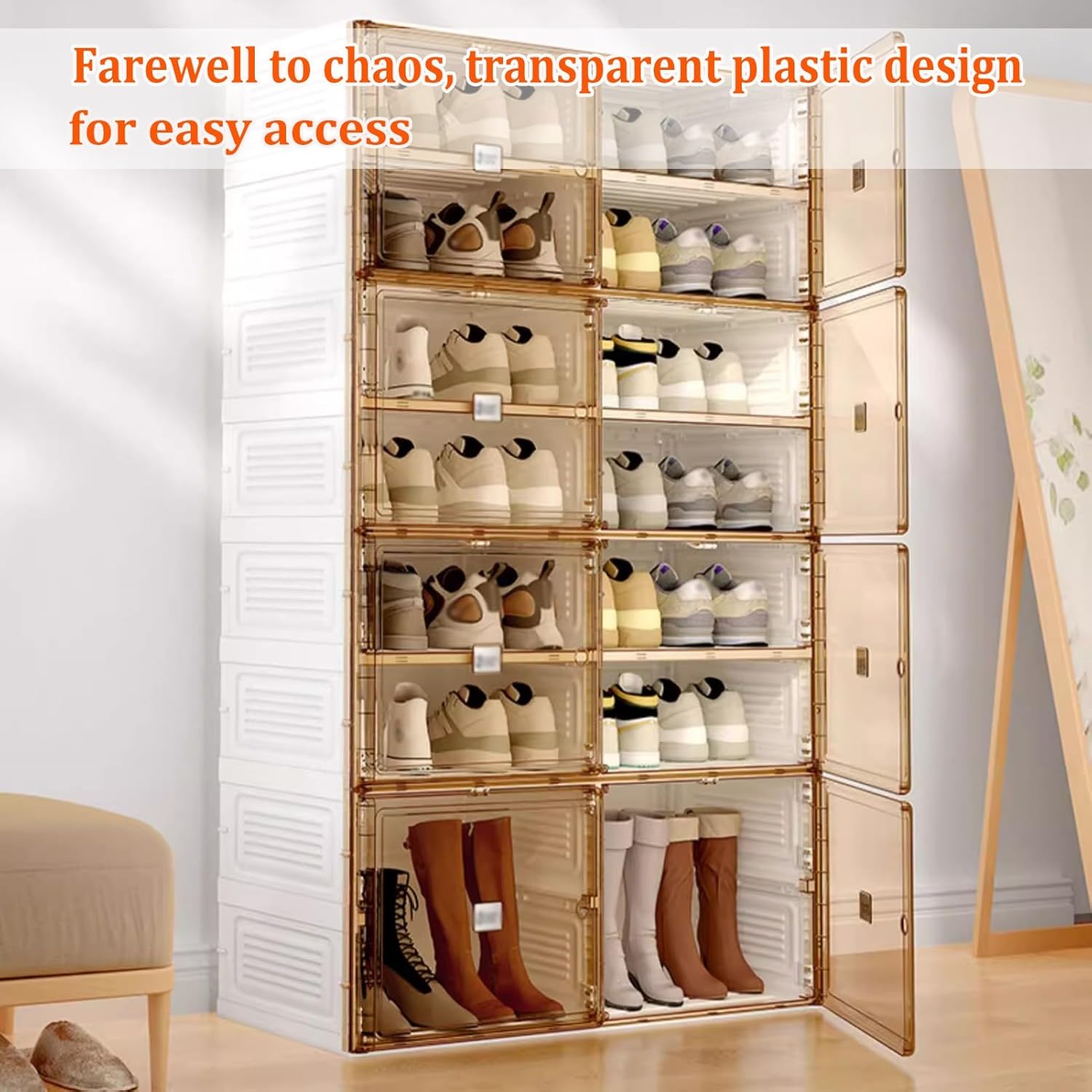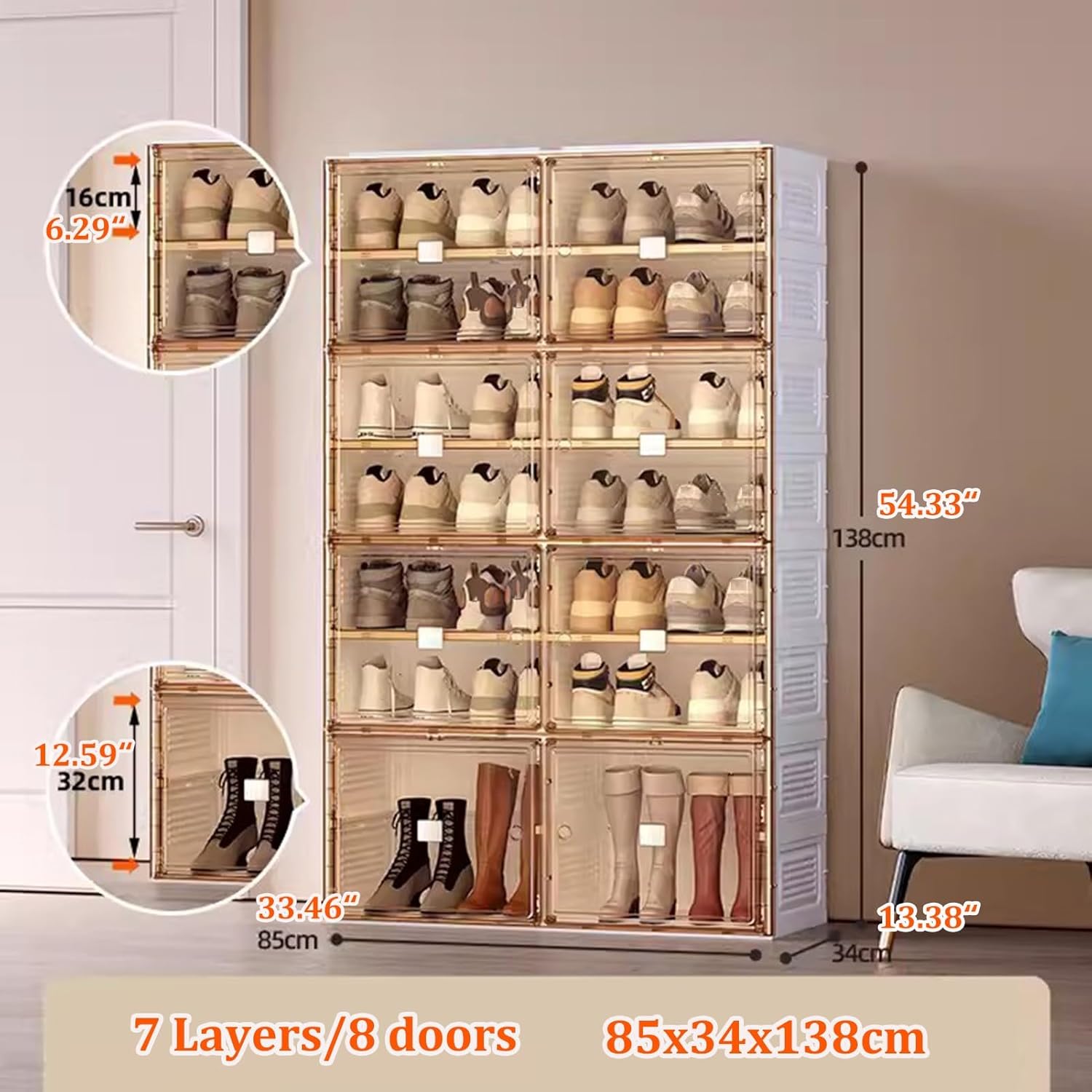 Stackable plastic shoe boxes will not only help you find a home for your shoes, Farewell to chaos, but also allow you to choose which one to wear at a glance and grab it with ease. We make your home better with simpler designs.Let you experience the fun of easy storage. Say goodbye to complicated installation,save time and effort. Free standing shoe racks is perfect for you! Sturdy & Stackable & Expandable: Foldable shoe box is use foldable integrated design which let more stable for shoe rack. The whole around the shoe storage box is made of high-quality PP material, which is durable, stylish and beautiful, for long-term use and protect your shoes from dust and moisture. Perfect choice for multifunctional storage: Stackable shoe boxes can be used to store many things, such as shoes, hats, bags, books, toys, crafts, etc.; Also great for closets, entryways, bedrooms, bathrooms, laundry rooms, craft rooms , office, playroom and garage, a cost-effective way to organize your shoes and closet, you can design and plan your home however you want. Product parameters: Name: Shoe Box/Shoe Cabinet Material: PP+PET+strong magnetic Size: 85x34x138cm Large capacity: 7-layer shoe box can store 28 pairs of shoes Do you need assembly: installation free