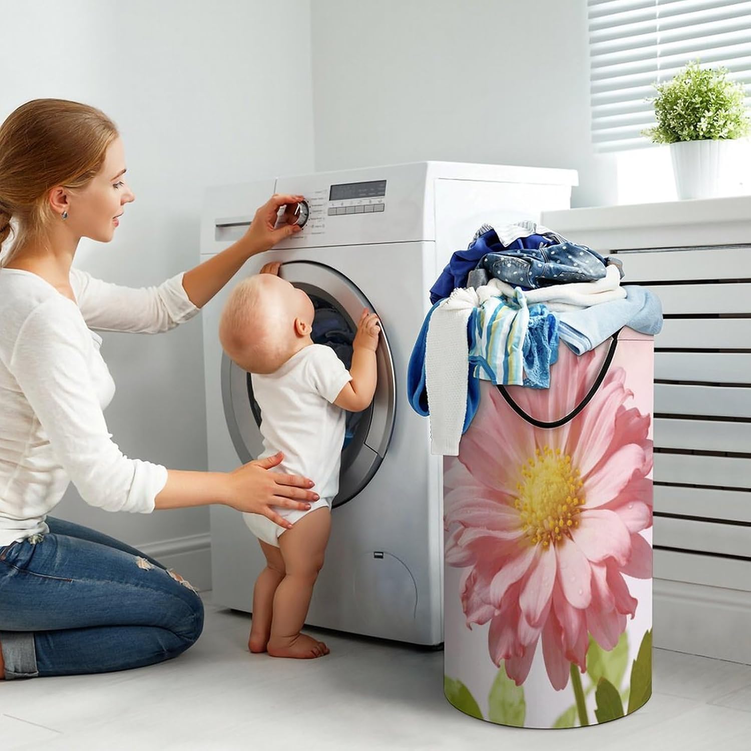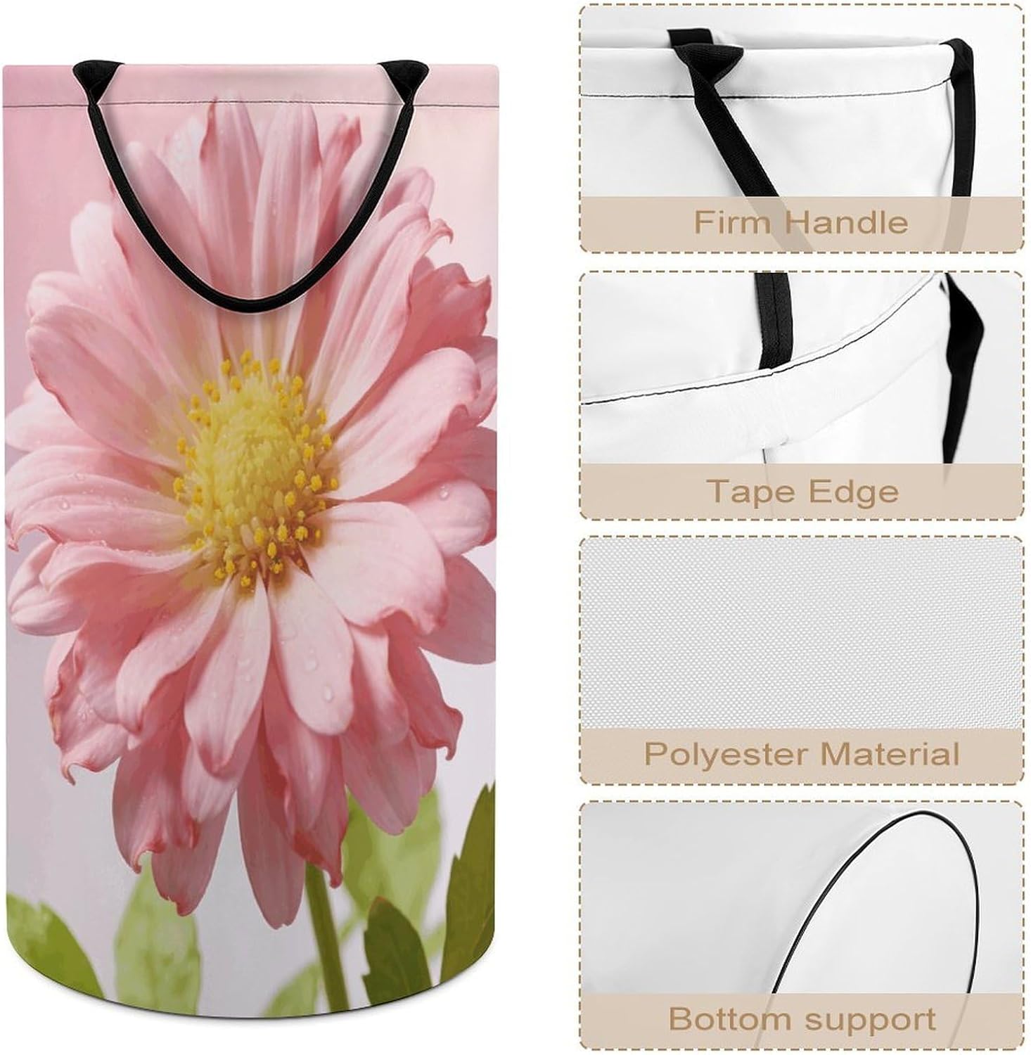 The pattern of the Soft Pink Daisy hamper is printed with exquisite patterns, which makes the product more attractive.Chic design allows it to be used in the living room to hold throw blanket, pillows, and reading materials, as well as in the bathroom for towels, or as a laundry hamper.The laundry hamper adopted collapsible design, equipped with handles. It is lightweight and portable for using, storing, and moving conveniently.Soft Pink Daisy Clothes hamper is suitable to store dirty clothes washing, place in the room to store toys, and other household goods, keep the house clean and tidy. Perfect laundry hamper for home, office, closet organizer, bedroom, bathroom, college dorm, etc.Gets out of your way when you need it to. This storage basket or laundry hamper is a good gift, which not only meets everyday storage needs but also carries deep care and love, a perfect way to turn thoughtfulness into warmth.
