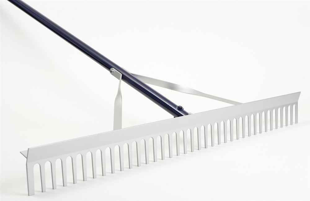 Lightweight 36 in. wide aluminum head for raking and smoothing landing pits and baseball infields. One side has long sturdy teeth. Other side has flat edge for leveling. Made from aluminum. Assembly required. 68 in. L x 6 in. W x 3 in. H (6 lbs.).
